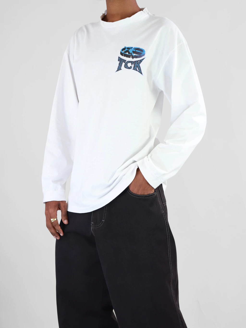 Esta camiseta de manga longa TCK é uma peça vintage autêntica dos anos 90, com etiqueta CGC, garantindo sua originalidade e procedência. Confeccionada em 100% algodão, a peça na cor branca apresenta uma padronagem marcante na parte traseira, com um design em mandala que incorpora imagens de surfistas e a frase "YOUR ATTITUDE IS YOUR EDGE", além do logo "TCK" em destaque com efeito pixelado em tons de azul e verde. Na parte frontal, na altura do peito esquerdo, há uma versão menor e simplificada da estampa traseira, também com o logo "TCK" e o mesmo efeito pixelado. A modelagem é ampla e confortável, característica das peças da época